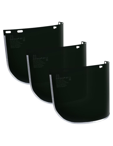- Modelo No. FC48G5 - Normas ANSI Z87.1 (EE.UU), CE EN1731 (Europa) - Especificaciones Tamaño del visor: 20.3x39.4 cm, Grosor del visor: 0.1 cm (1.0 mm), Material del visor: Policarbonato con filtro UV - Características (1) Mejor calidad óptica Para proporcionar a los usuarios la mejor visión posible y ayudarles a concentrarse mejor en su tarea, los visores de Blue Eagle han pasado los niveles más altos de pruebas ópticas (Clase 1), incluyendo poder refractivo esférico, poder refractivo astigmático, poder refractivo prismático y difusión de luz. (2) Películas protectoras Ambos lados de los visores están equipados con películas protectoras para asegurar protección contra daños o rasguños durante el transporte. Estas películas se pueden quitar fácilmente antes de su uso. (3) Resistencia al impacto Incluye resistencia al impacto frontal y lateral. (4) Refuerzos de aluminio Los refuerzos de borde de aluminio pueden ayudar a mejorar la resistencia del visor. Un usuario también puede doblar o ajustar fácilmente el visor para adaptarse a los requisitos de uso. (6) Resistencia al impacto de partículas a alta velocidad en extremos de temperaturas, 120 m/s El visor está hecho de policarbonato (PC) de grado de extrusión con las especificaciones más altas para resistencia mecánica, lo que le permite soportar el impacto de una bola de acero de 6 mm viajando a una velocidad de 120 m/s en extremos de temperaturas. (7) Protección UV profesional Utilizamos tecnologías avanzadas para proporcionar al usuario una protección profesional contra los UV. (8) Protección contra salpicaduras y líquidos Los visores grandes proporcionan un amplio campo de visión y protección contra salpicaduras y líquidos. (9) Resistencia a la ignición Una varilla de hierro de 6 mm de diámetro y 300 mm de longitud se calentó en un extremo a una temperatura de 650C. El extremo calentado se presionó contra la superficie de la muestra utilizando su propio peso durante 5 segundos. El visor no se incendió ni brilló en rojo. (10) Reemplazo rápido y fácil del visor (11) HECHO EN TAIWÁN