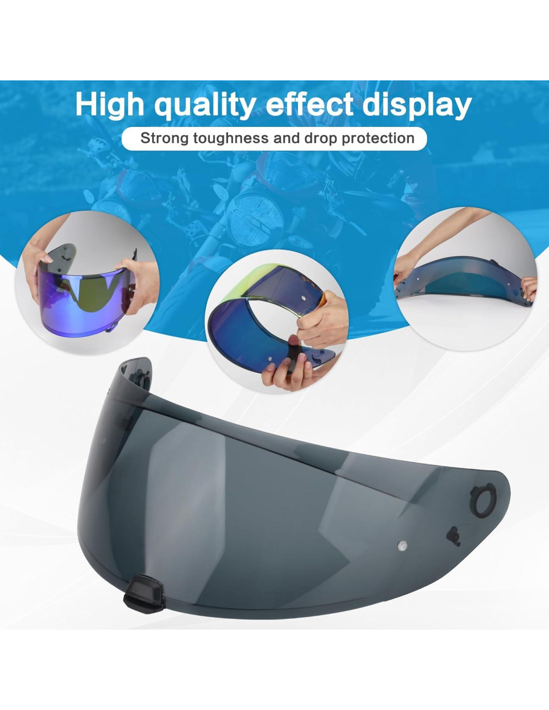 - Material de Alta Calidad Fabricada con policarbonato avanzado, esta visera de casco ofrece una resistencia al impacto superior y claridad. Disfrute de una vista sin obstrucciones con una distorsión mínima, lo que la hace ideal para conducir tanto de día como de noche.