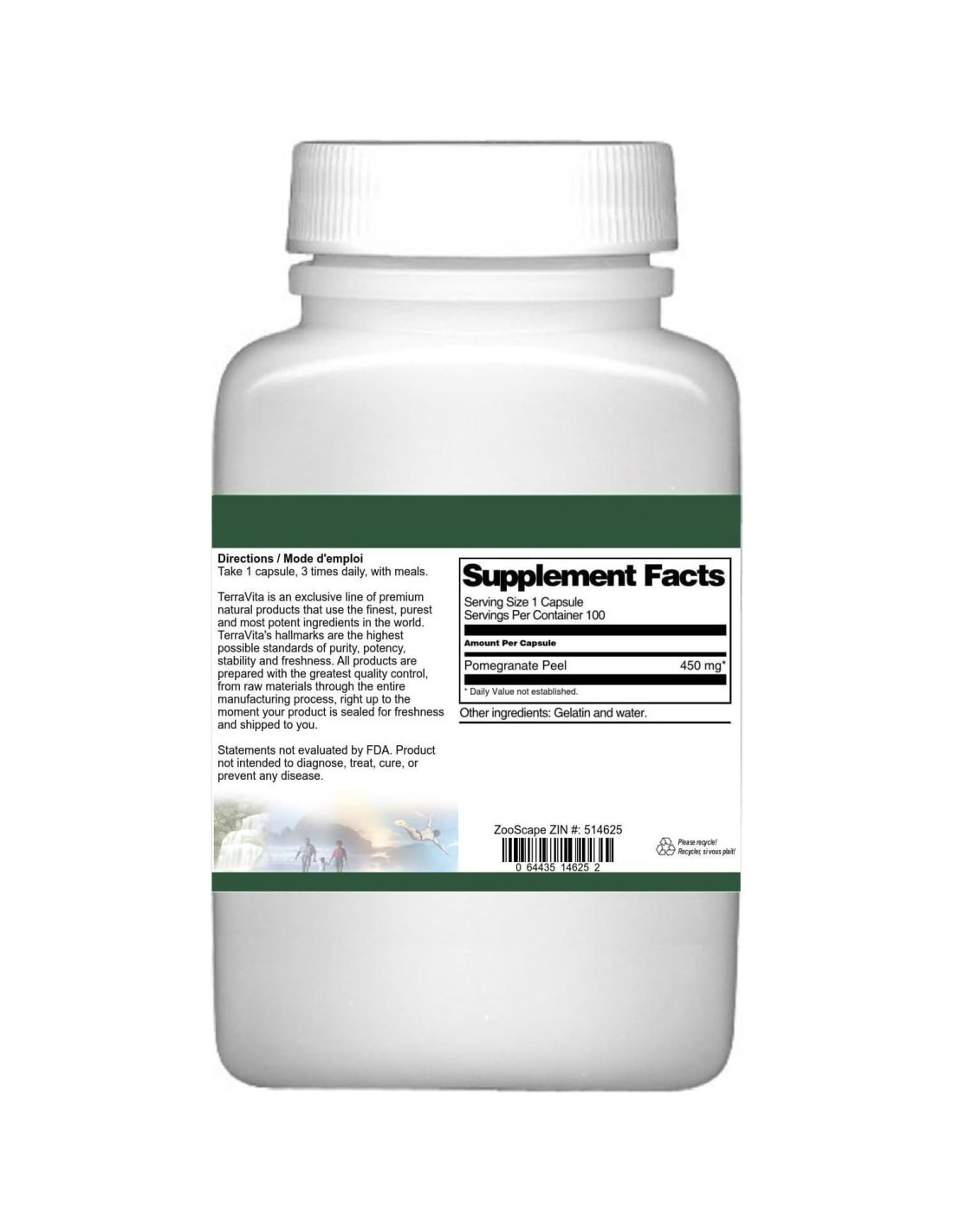 Cáscara de Granada - 450 mg (100 cápsulas, ZIN: 514625) Empacado en los Estados Unidos en una instalación certificada por GMP (Buenas Prácticas de Manufactura). Sin rellenos. Fabricante: TerraVita Tamaño: 100 cápsulas Cápsulas fáciles de tragar en un frasco sellado. Ingredientes: Gelatina, Agua, Cáscara de Granada - 450 mg