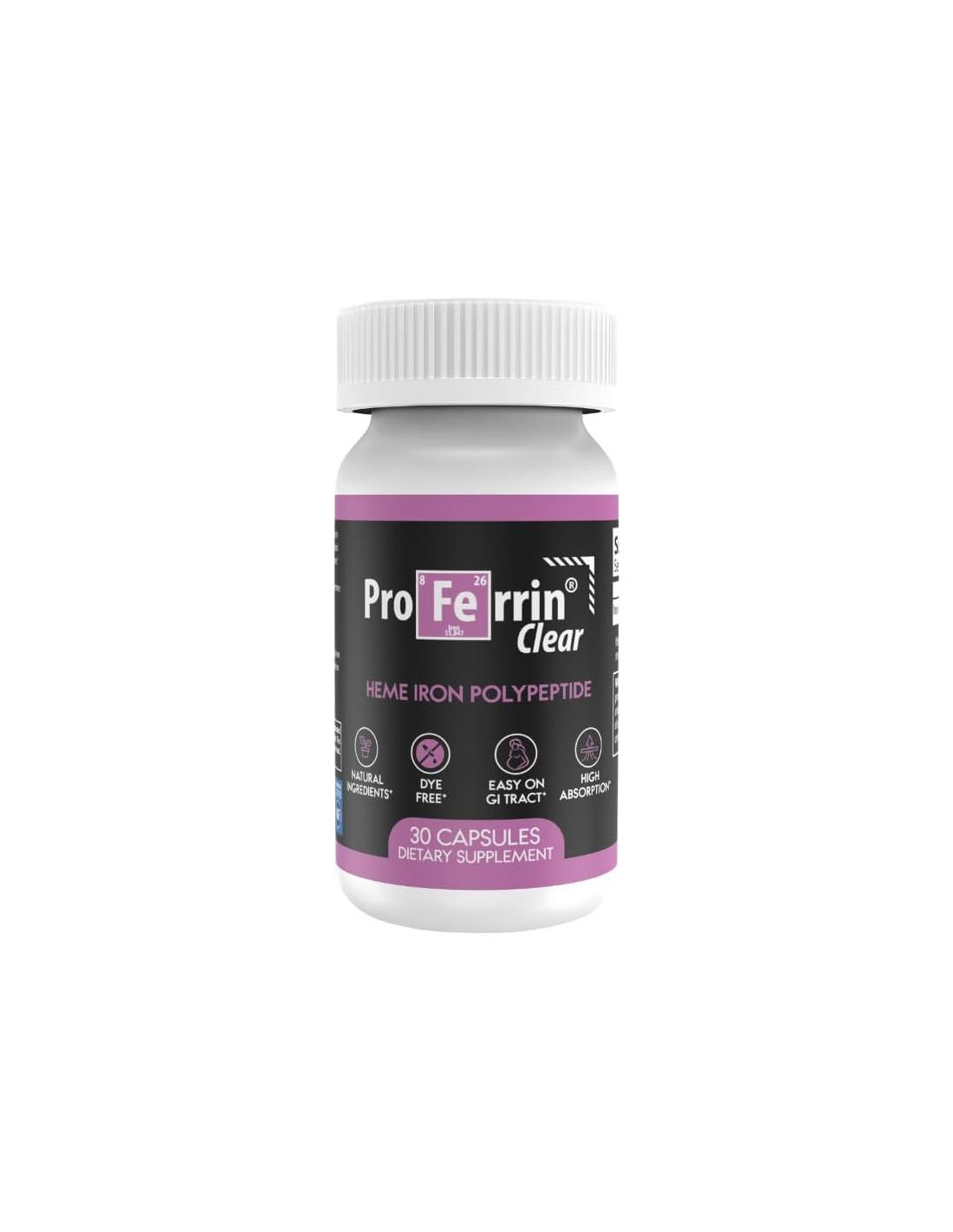 Proferrin Clear es el mismo gran hierro heme que se hace a partir de glóbulos rojos comestibles de USDA, ahora en una cápsula libre de colorantes. Uso recomendado: Tome una tableta hasta tres veces al día, con o sin comida. Proferrin Clear debe almacenarse a temperatura ambiente. Estas declaraciones no han sido evaluadas por la Administración de Alimentos y Medicamentos. Este producto no está destinado a diagnosticar, tratar, curar o prevenir ninguna enfermedad.