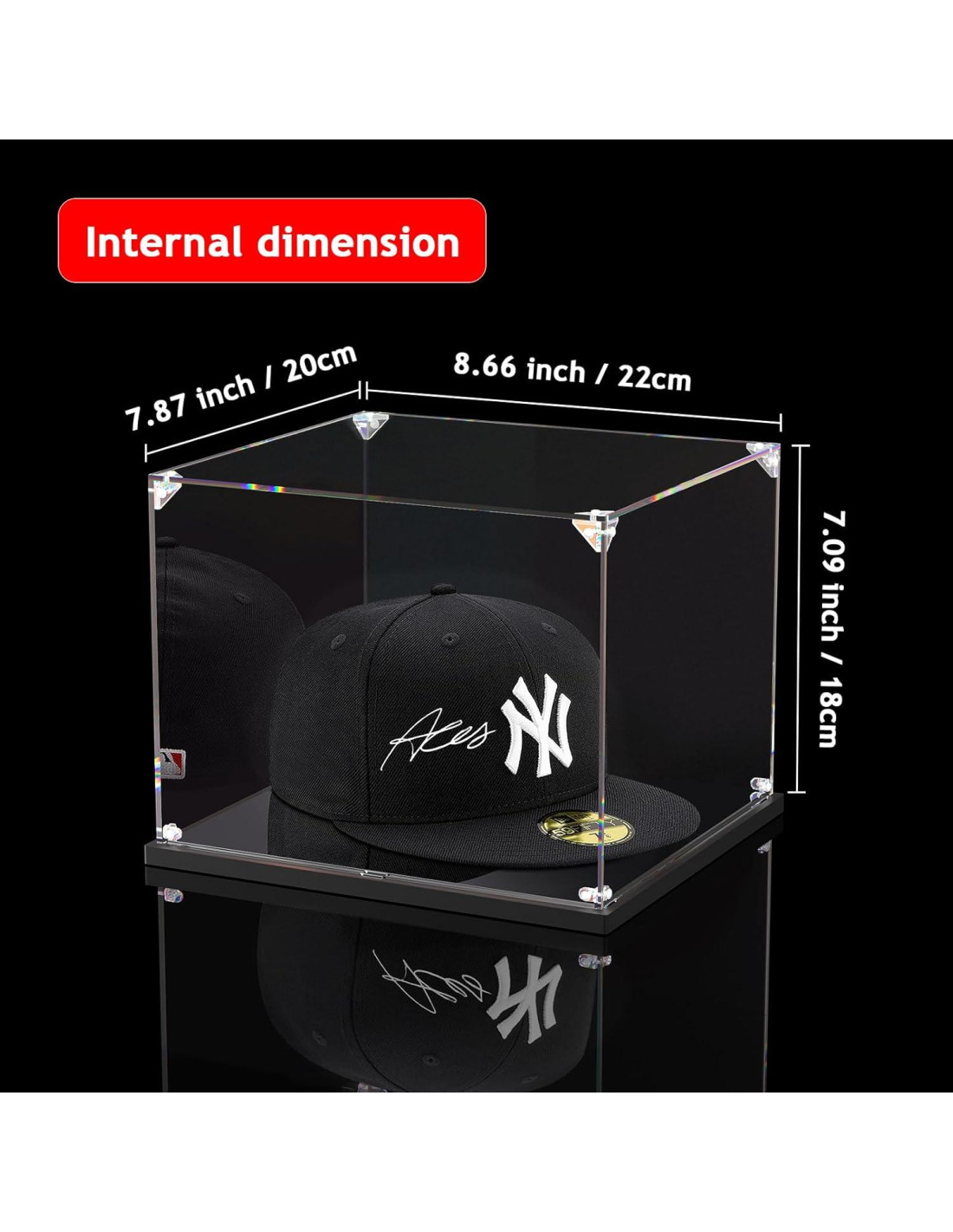 - [Ajuste para Todos los Tamaños] El tamaño interior de la caja de exhibición para gorras es de 8.7x7.9x7.1 pulgadas, lo que es lo suficientemente grande para acomodar todos los tamaños de gorras. NOTA: por favor, retira la película protectora en ambos lados de cada panel de acrílico antes del montaje.