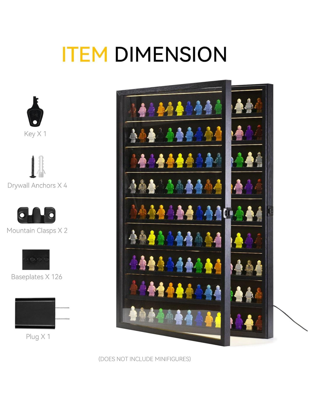 - ADECUADO PARA - Compatible con minifiguras y juguetes de bloques de construcción. Las dimensiones generales de las vitrinas de minifiguras son aproximadamente 68.5 cm x 47.8 cm x 5.1 cm (H x W x D). Viene con 126 placas base para estabilizar las figuras con la base en el marco de exhibición. Diseño de 9 niveles, puede contener hasta 126 minifiguras. TENGA EN CUENTA que el paquete NO incluye Minifiguras. Por favor, retire la película protectora de la puerta de acrílico antes de usar.