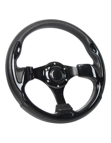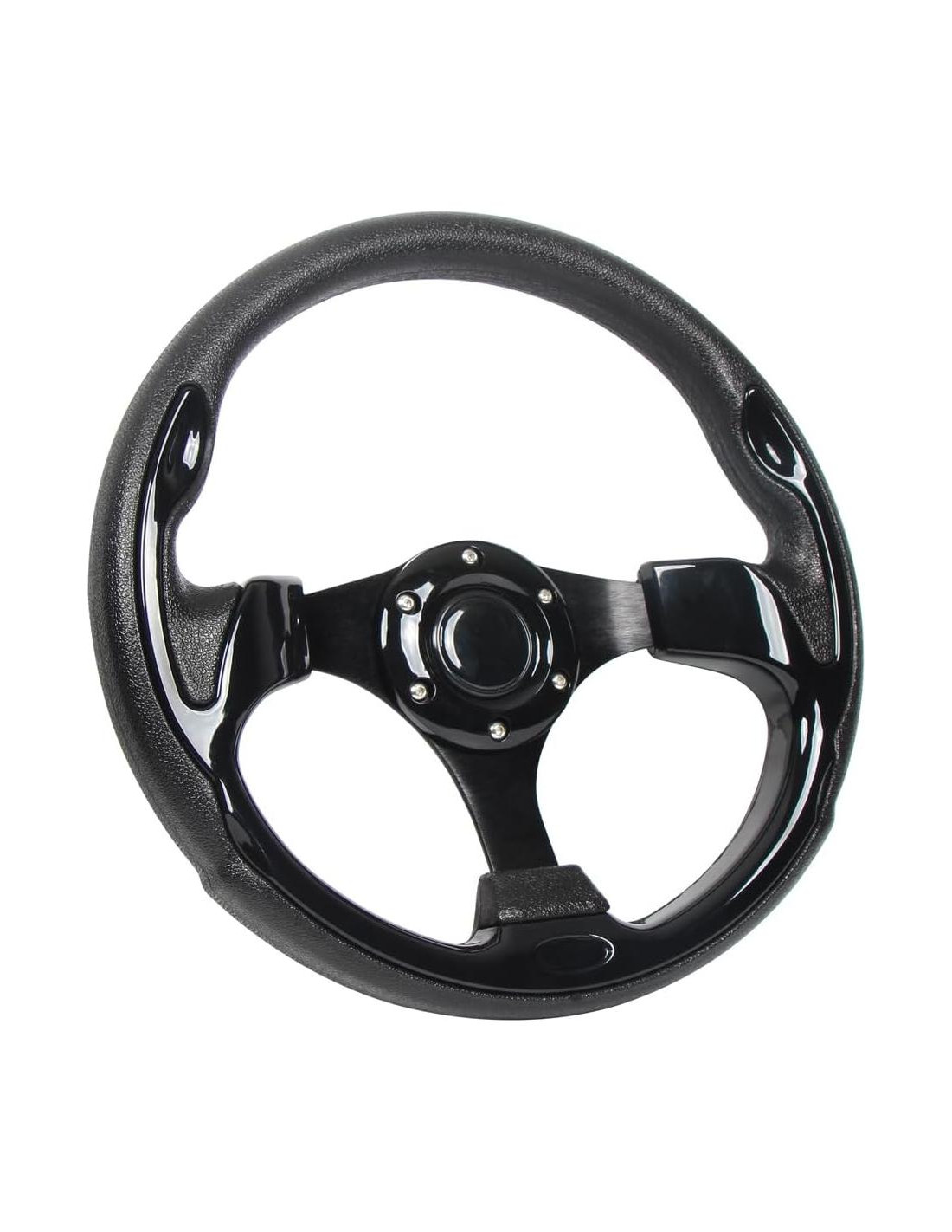 El volante de carro de golf se adapta a la mayoría de los carros de golf. El volante de carro de golf completamente negro puede proporcionarte más espacio para entrar y salir del carro. Tiene un agarre de poliuretano con un recubrimiento adicional de urethane para mejor resistencia al calor y mayor durabilidad. El botón del claxon es solo.