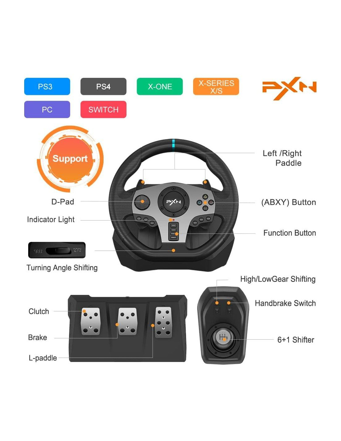 El volante PXN V9 se utiliza en PC, y el PC/APP lo reconoce como PS3 HID, y no ingresará al D-input/X-input. Esto se puede resolver actualizando el firmware. Puedes descargarlo desde el sitio web oficial. Abre el sitio web oficial de PXN, haz clic en Soporte-Herramientas, y descarga el paquete de firmware V9 V2.35 (e-pxn.com/sites/pxn/files/tools/v9the-firmwarev2.35_0.zip). Después de que el PXN V9 esté conectado a PS4, el volante no responde. No hay conexión directa cuando el volante PXN V9 funciona en PS4. Necesitas primero conectar el volante con el controlador original de la consola y luego conectar el volante con un cable de datos. ¿Necesito un soporte para usar esto o puedo adjuntarlo a mi escritorio? El conjunto de volante PXN V9 viene con 2 clips en forma de C para fijar, y hay 5 ventosas fuertes en la parte inferior del volante. Cuando está conectado a SWITCH, el pedal no funciona. Cuando el PXN V9 está conectado a SWITCH, el acelerador se establece de forma predeterminada en el botón Y, y el freno se establece de forma predeterminada en el botón B (en línea con Mario Kart). Si necesitas cambiarlo, puedes hacerlo en la APP. ¿Por qué el volante no vibra cuando está conectado a PS4? Cuando el volante está conectado a la palanca de cambios, está en modo volante en PS4, que en sí mismo no vibra. No afecta a la PC, el volante vibrará. Desde su establecimiento en 2004, PXN ha estado adhiriéndose al concepto de marca de "conocer mejor a los jugadores" y adaptándose a las necesidades de varios escenarios de juego. El profesionalismo y el multi-escenario son los conceptos de nuestros productos y servicios. Los productos cubren el lado de PC y el lado de consola, y satisfacen las necesidades de los usuarios en varios escenarios de juego. Soporta la mayoría de las plataformas principales y realiza múltiples funciones en una sola máquina. Soporta la mayoría de los juegos de carreras.