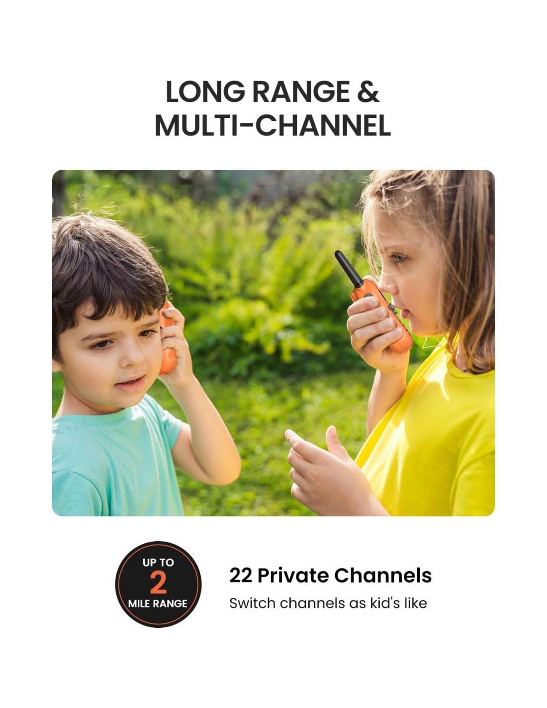 - MULTICANAL Y LARGO ALCANCE: Con 22 canales y un alcance de hasta 3.22 kilómetros (2 millas), nuestros walkie talkies para niños soportan comunicación uno a uno o uno a más, permitiendo a los niños disfrutar de juegos de larga distancia con transmisión de voz clara. La función de bloqueo de clave asegura que los niños permanezcan en el mismo canal durante el juego.
