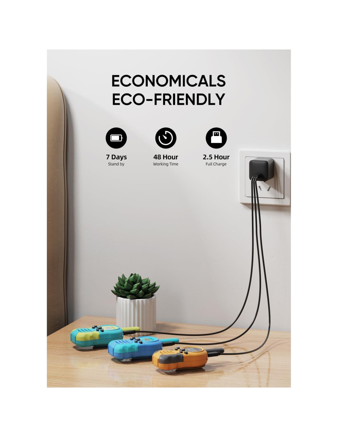 - RECARGABLE Y ECOLÓGICO: ¡Diga adiós a la compra y cambio frecuente de baterías! Nuestros walkie talkies recargables para niños están equipados con una batería de litio recargable no removible y un cable de carga USB 3 en 1 (adaptador no incluido) que puede cargar dos walkie talkies a la vez. La batería cuenta con un impresionante tiempo de conversación de 48 horas y un tiempo de espera de 7 días.