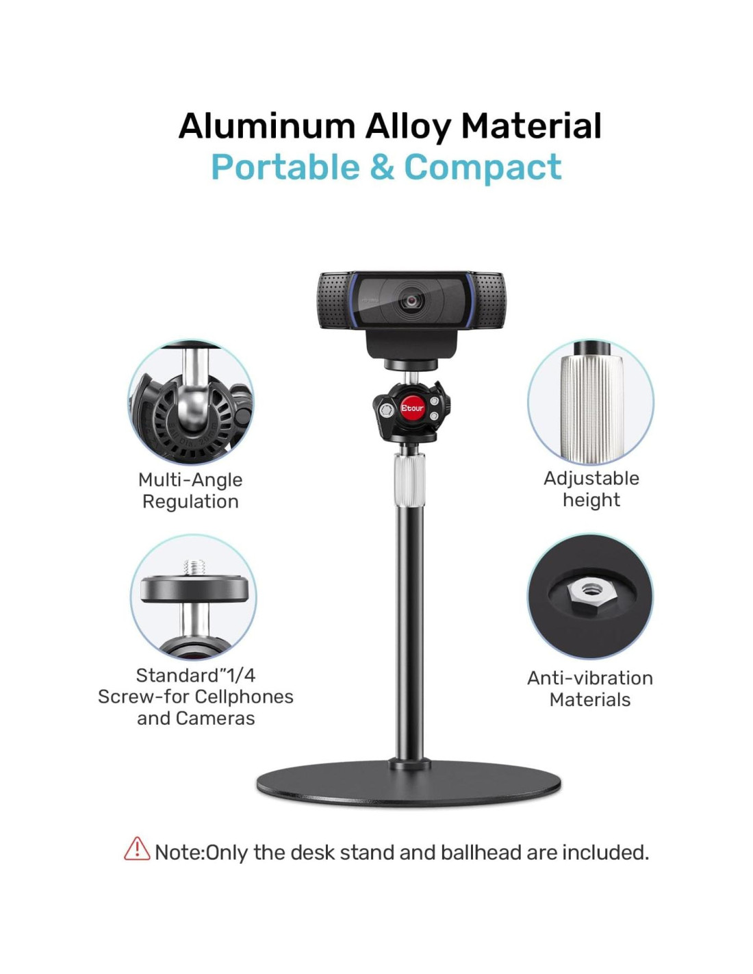- [Dentro de la Caja] El paquete incluye: 1 x Base de alta resistencia, 1 x Varilla telescópica, 1 x Cabezas de bola de rotación. NOTA: Solo incluye soporte de escritorio y cabeza de bola (webcam no incluida)