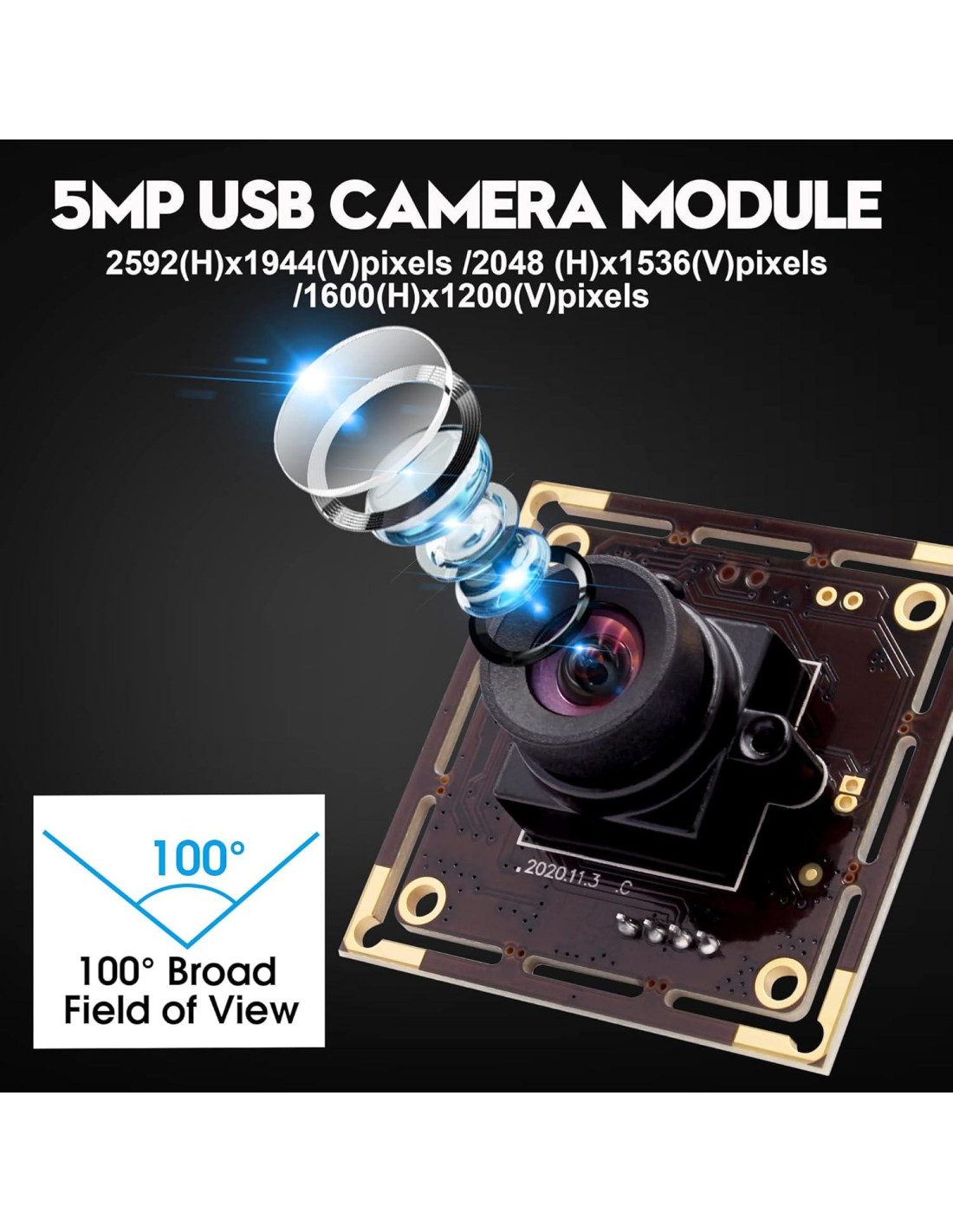 - Módulo de cámara USB con lente de 100 grados sin distorsión, aproximadamente 85 grados FOV, imagen y video sin distorsión, bajo consumo de energía, ideal para equipos portátiles.