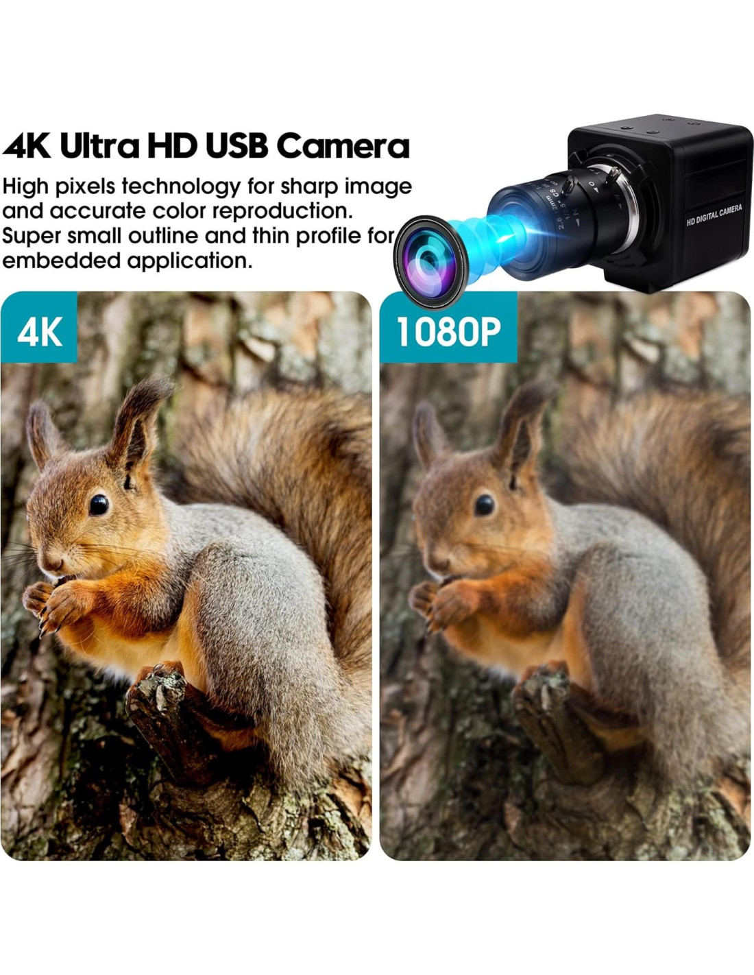 - Cámara USB 4K Sony IMX317: cámara USB con sensor de imagen sony IMX317. La lente varifocal manual de 2.8-12mm puede proporcionar una imagen nítida. La cámara USB está especialmente diseñada y optimizada para producción de video profesional, fabricación de sistemas de vigilancia, visión industrial. La resolución máxima de algunos software o pantallas solo soporta 1080P o 720P, para disfrutar de imágenes o videos ultra claros de 4K 8 megapíxeles de esta webcam, asegúrese de que su software y pantalla soporten 4K.