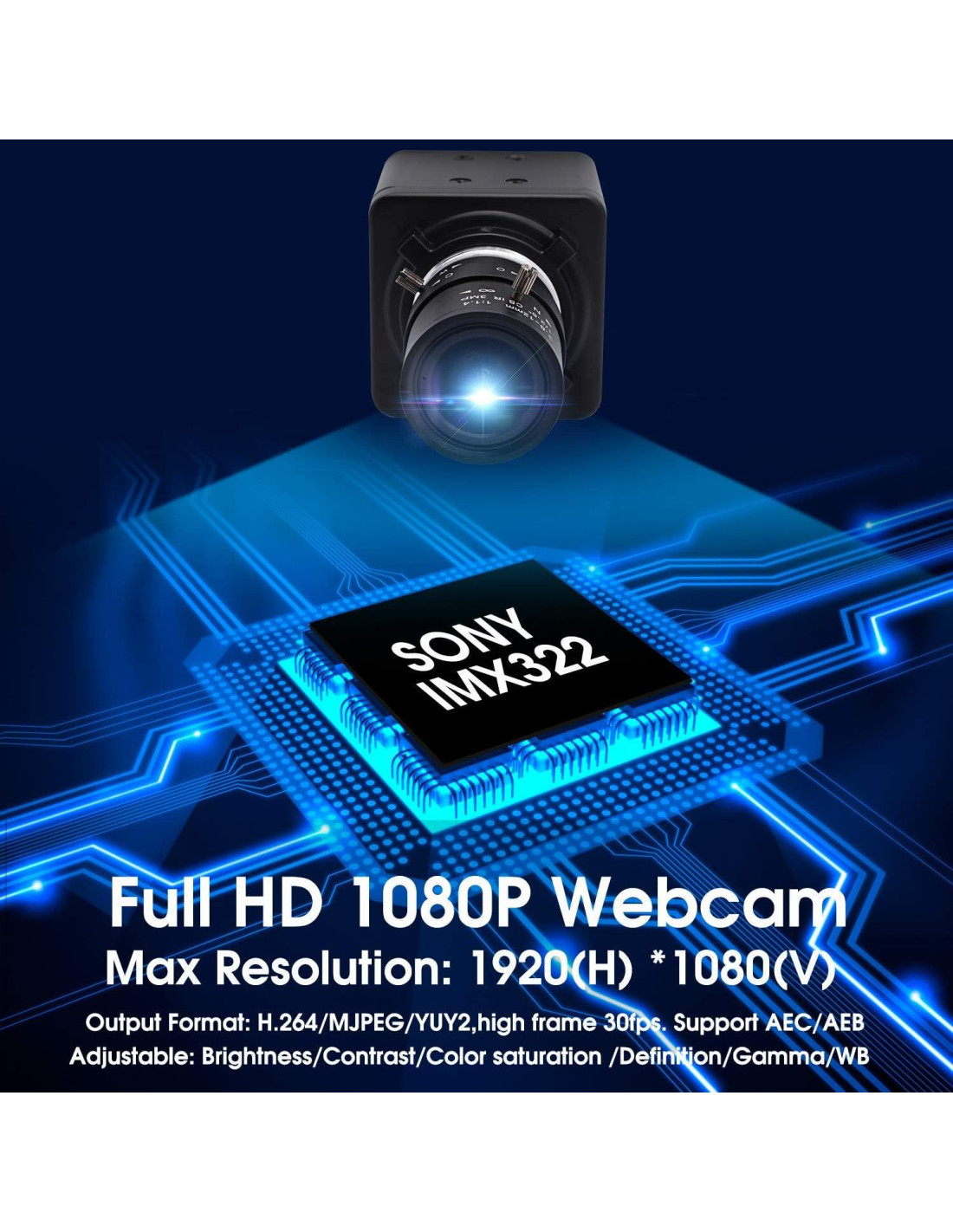 - FHD 1080P Alta Definición con Sensor Sony IMX322 Cámara USB HD adoptó sensor Sony IMX322 de alta calidad con resolución máxima de 1920x1080 para entregar imágenes nítidas y claras de manera efectiva. Formato de salida de webcam USB 2.0 soporta H.264/MJPEG/YUY2. Alta tasa de 30pfs