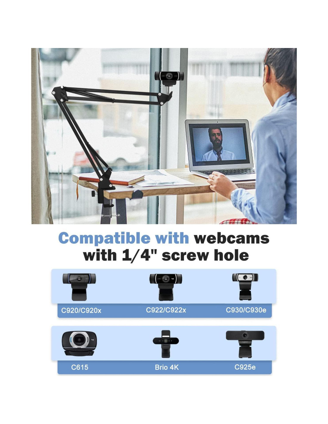 - Fuerte Compatibilidad - El soporte de escritorio para webcam tiene rosca de 1/4 que es compatible con todas las webcams y algunas cámaras pequeñas que están diseñadas con orificio de tornillo de 1/4, como Webcam Logitech C920, C920s, C922, C922x, C930e, C930, C615, C925e, Brio 4K.