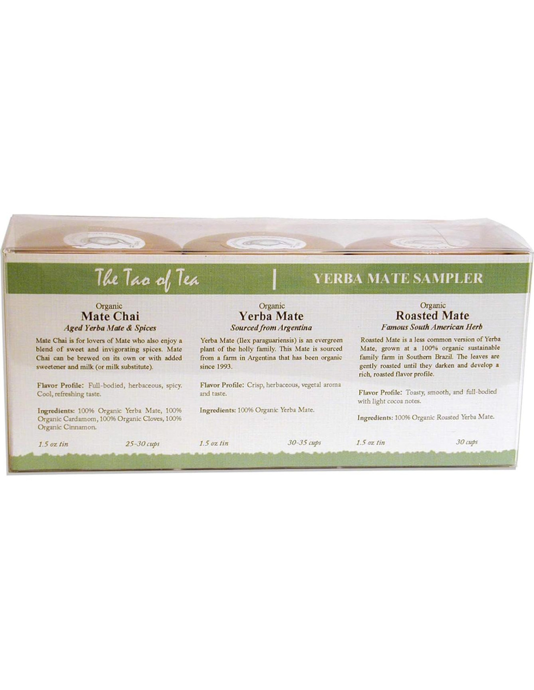El set de muestra de Yerba Mate incluye tres pequeñas latas empaquetadas en acrílico. Este set es un regalo perfecto para un amante del Mate o una buena manera de ser introducido al Yerba Mate. Cada lata contiene 42.5 g (1.5 oz) de hojas, tiene tapas dobles para un cierre hermético y puede ser reutilizada. A continuación se enumeran las variedades de Yerba Mate presentadas en la muestra: Mate Tostado - Las hojas de este único Mate del sur de Brasil son tostadas para dar un cuerpo completo y un sabor a chocolate. Yerba Mate - El clásico Mate argentino envejecido, un miembro perenne de la familia de las acebos, Ilex paraguariensis. Un aroma y sabor herbáceo, vegetal y crujiente. Mate Chai - Esta mezcla totalmente orgánica está hecha con Mate, clavos, canela y cardamomo. Un sabor fresco y refrescante.