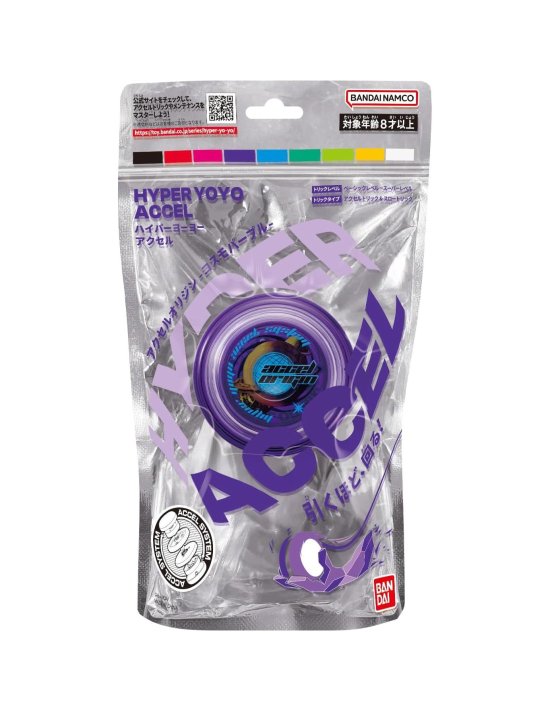 - El "Accel Origin - Cosmo Púrpura" es un yoyo con un cuerpo púrpura claro que presenta un diseño inspirado en el cosmos.