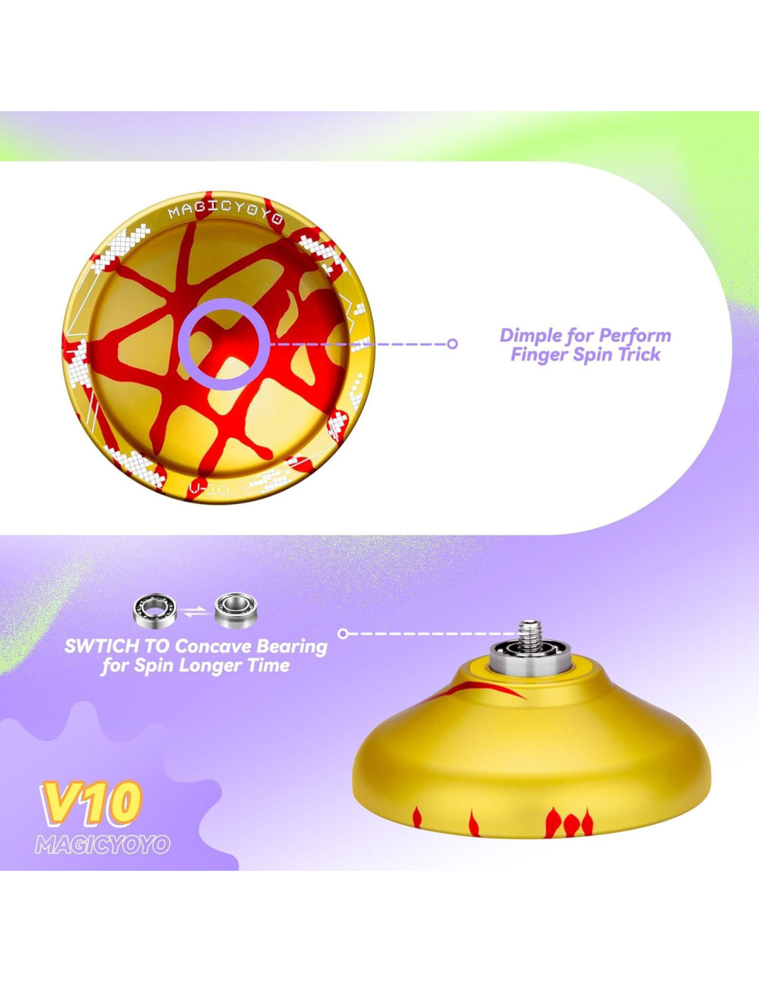 - Yoyo No Responsivo Profesional: El yoyo fingerspin MAGICYOYO V10 es un yoyo profesional destinado a jugadores avanzados que exigen alto rendimiento. Adopta un Rodamiento Premium, el Yoyo viene con un Rodamiento de Acero Inoxidable pre-lubricado (10 bolas) con el Rodamiento de Velocidad MAGICYOYO instalado