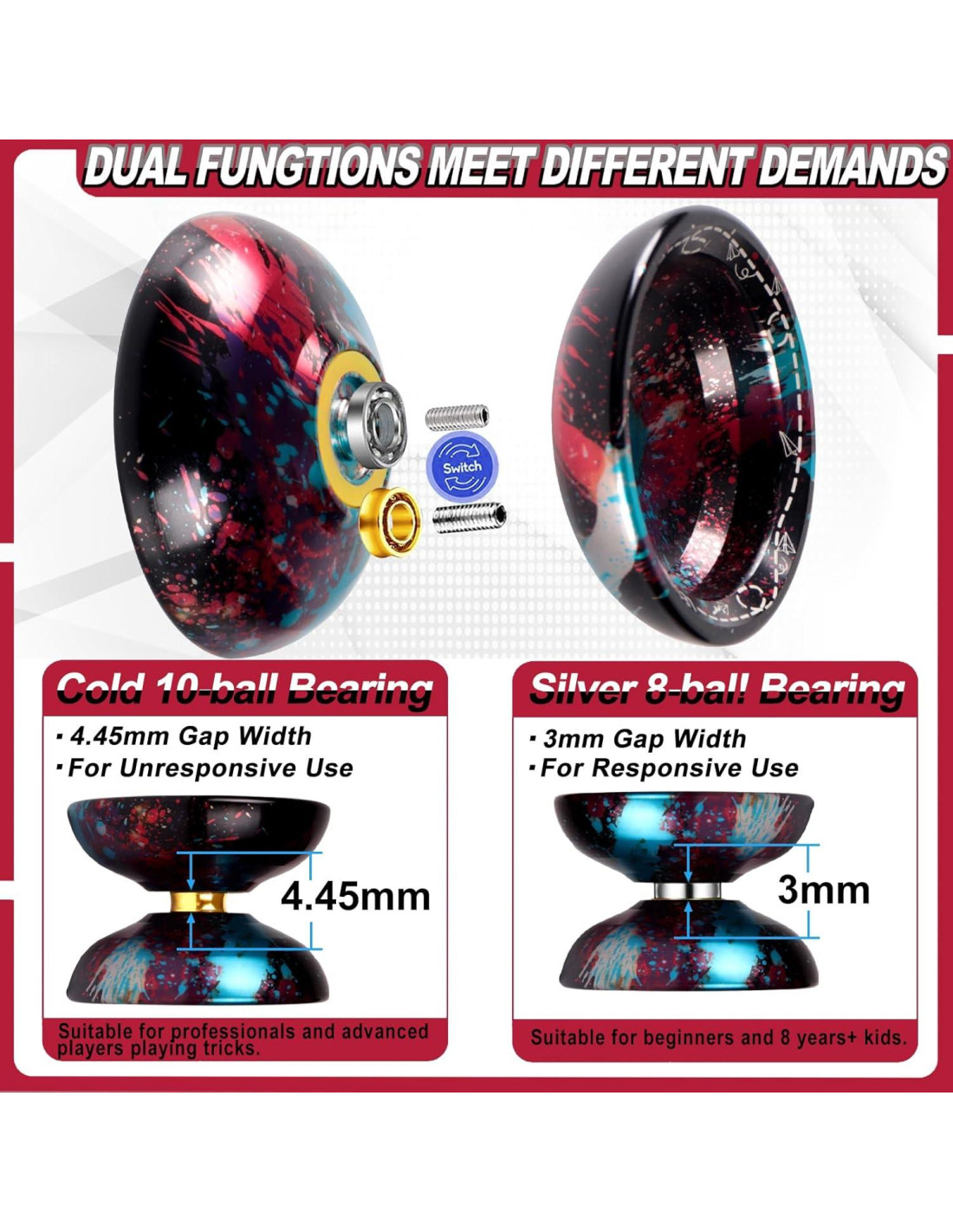 - Funciones Dobles: El Yoyo Profesional JOLESHARE puede reemplazar rodamientos según sea necesario. Los rodamientos t son responsivos y regresarán automáticamente después de ser lanzados con un suave tirón, adecuados para principiantes y adultos; los rodamientos u no son responsivos y no regresarán automáticamente después de ser lanzados, por lo que necesitas aprender habilidades de unión para hacer que el yoyo regrese. Es la elección perfecta para profesionales, principiantes o cualquier persona que quiera un yoyo de alto rendimiento. (1A, 3A, 5A)