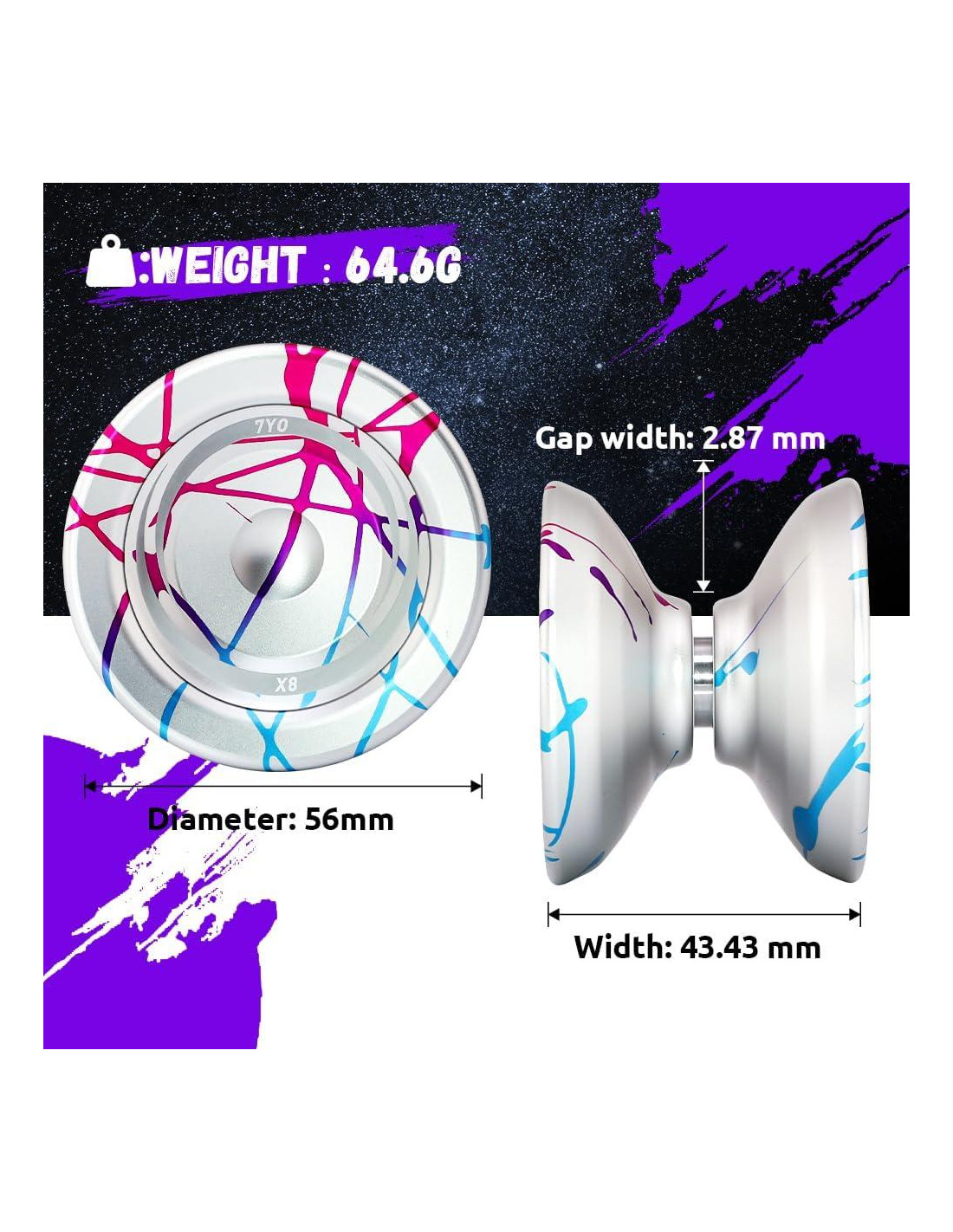 - ALTA CALIDAD SE SIENTE GENIAL: Este yoyo profesional X8 está hecho de aluminio premium anodizado en púrpura y azul que se siente genial en tu mano, es ligero (2.3 onzas) (65,2 g), duradero y superior en rendimiento. Y el diseño de construcción 'mariposa' es hermoso y estable en giro.