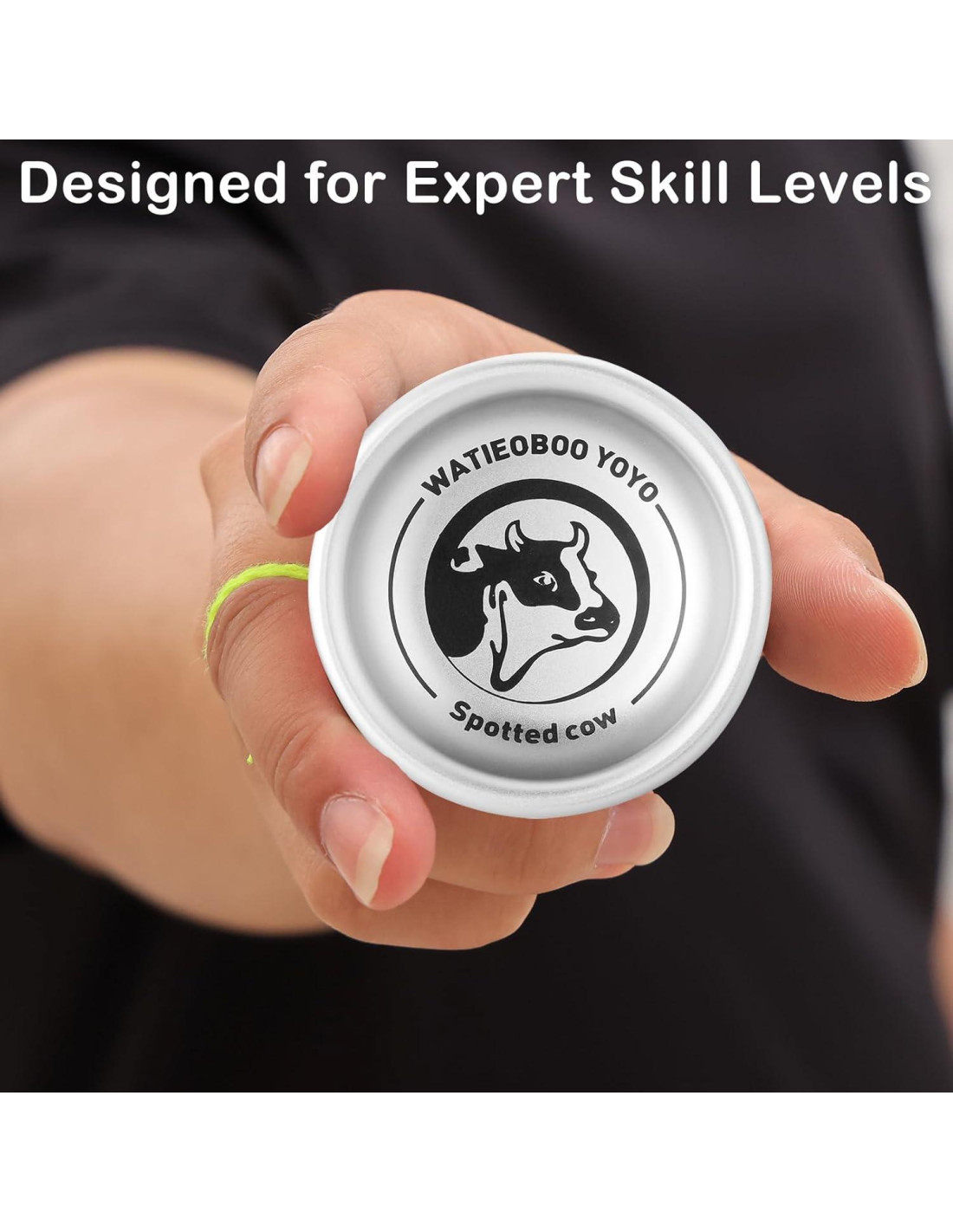 - Yoyo de Metal de Aluminio: El Yoyo Vaca Manchada está fabricado con materiales de grado aeroespacial de alta precisión, con una carcasa de bola de aleación de aluminio y un rodamiento de acero inoxidable. Estas mejoras aumentan la resistencia al impacto y a las caídas del yoyo de aluminio. Este yoyo mariposa gira suavemente y posee fuertes capacidades de inactividad, lo que lo hace perfecto tanto para juegos como para la práctica diaria.