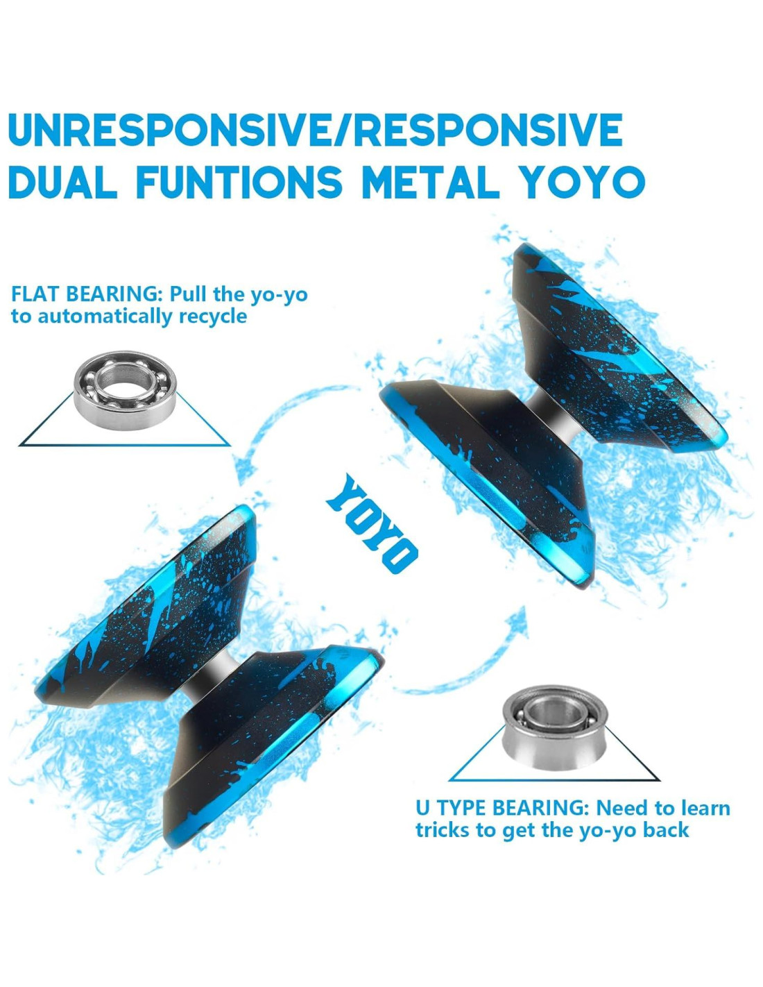 - YOYO DE DOBLE PROPÓSITO - El yoyo profesional de metal equipado con un rodamiento plano estándar, hace que este yoyo de aluminio sea responsivo. Este yoyo pro es un yoyo no responsivo para jugadores avanzados también. Reemplázalo con un rodamiento en forma de U usando la herramienta de extracción de yoyo, y se convertirá en un yoyo no responsivo. Necesitarás aprender un truco llamado "bind" para traer de vuelta el yoyo. Adecuado para jugadores avanzados de yo yo y jugadores profesionales de yoyo.