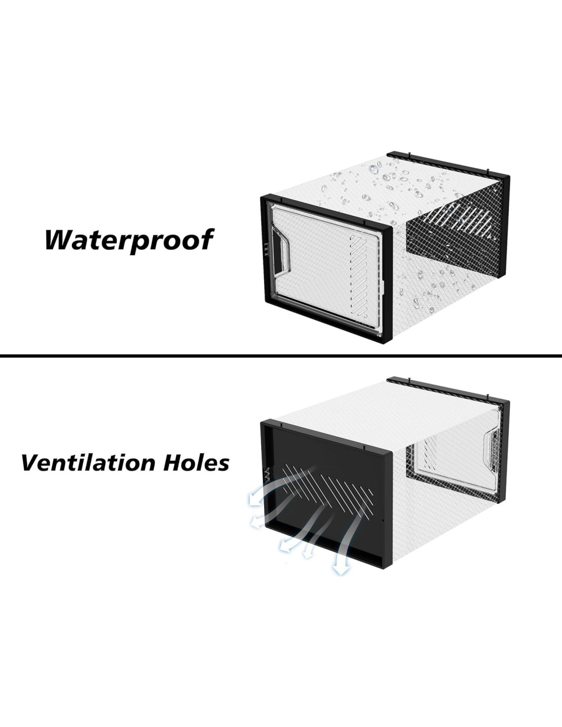 - Por qué elegirnos: Más espacio + varilla de aromaterapia + puerta magnética + agujeros de ventilación. La caja de zapatos se adapta a tallas de hasta 12 de hombre. La varilla de aromaterapia y el gran agujero de ventilación aseguran la circulación del aire y la prevención de olores. Tacones, planos, zapatillas, chanclas, sandalias, cuñas y más, solo colócalos.