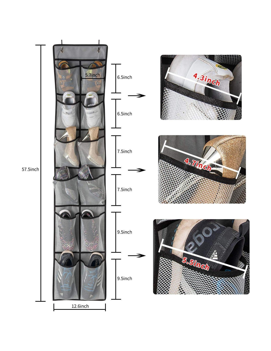 Es muy útil para almacenar diferentes tamaños de zapatos para toda la familia. Además de usarlo para almacenar tus zapatos, este organizador de zapatos sobre la puerta también se puede usar para guardar calcetines, corbatas, bufandas e incluso juguetes, suministros de cocina, artículos de tocador, suministros de limpieza. Puedes colgarlo sobre la puerta, en el baño, despensa, hotel, dormitorio, universidad y en cualquier lugar que necesites. Y se puede plegar en un tamaño pequeño para viajar. Especificaciones del organizador de zapatos: Tamaño del producto: 146.1cmL x 63.5cmW Color: Gris Tamaño de los bolsillos: 2 Bolsillos superiores: 16.5cmH x 24.1cmW para niños 2 Bolsillos intermedios: 19.1cmH x 29.2cmW para mujeres 2 Bolsillos inferiores: 24.1cmH x 29.2cmW para hombres Paquete del estante de zapatos colgante incluido: 2 x 12 Bolsillos detrás del organizador de zapatos sobre la puerta 4 x Ganchos de acero inoxidable ajustables