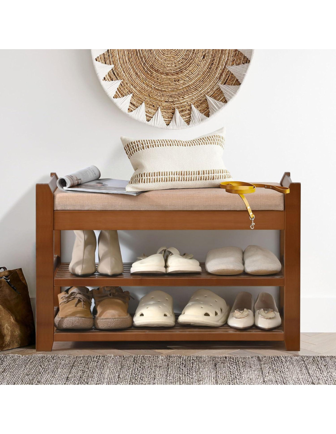 - COJÍN CÓMODO - Con un cojín de 4.7 cm de grosor tapizado en tela beige, nuestro banco de entrada ofrece una comodidad y soporte excepcionales para ponerse o quitarse los zapatos.