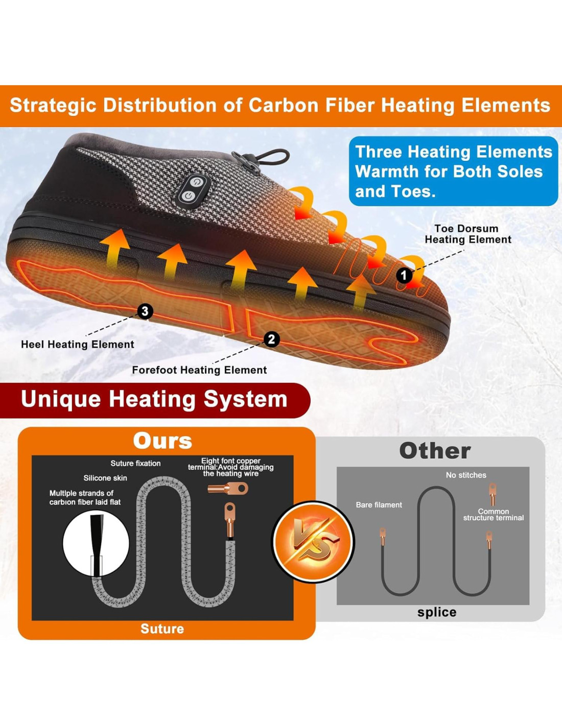 - Calor invernal con botones de control dual. Experimenta calor en todo el cuerpo con la función de calefacción de doble cara de estas zapatillas eléctricas. Con una batería de 5000 mAh, puede proporcionar de 2.5 a 6 horas de calor. El control de temperatura específico por zona te permite disfrutar del calor más agradable.