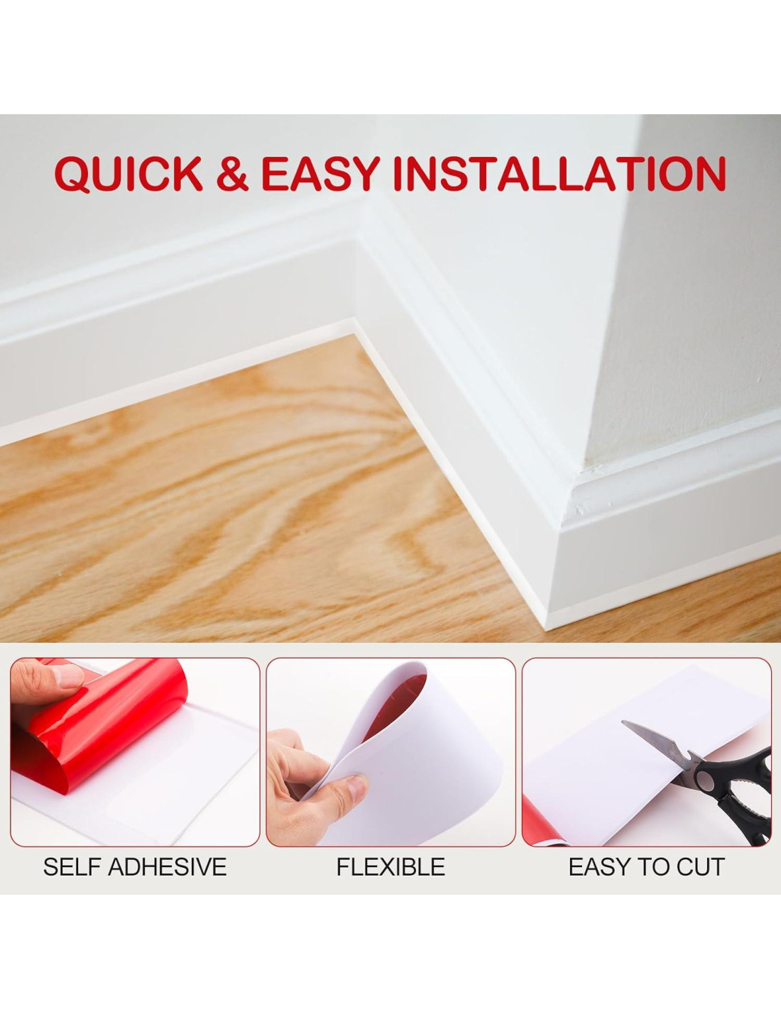 - [PROTEGER PAREDES] - La moldura de zócalo es suave y delgada, lo que puede cubrir las irregularidades y huecos en la superficie de la pared, haciendo que la pared se vea limpia y hermosa. La línea de anclaje proporciona protección para paredes, muebles y mascotas. El polvo y las manchas en la superficie son fáciles de limpiar, no se desvanecen ni se deforman.