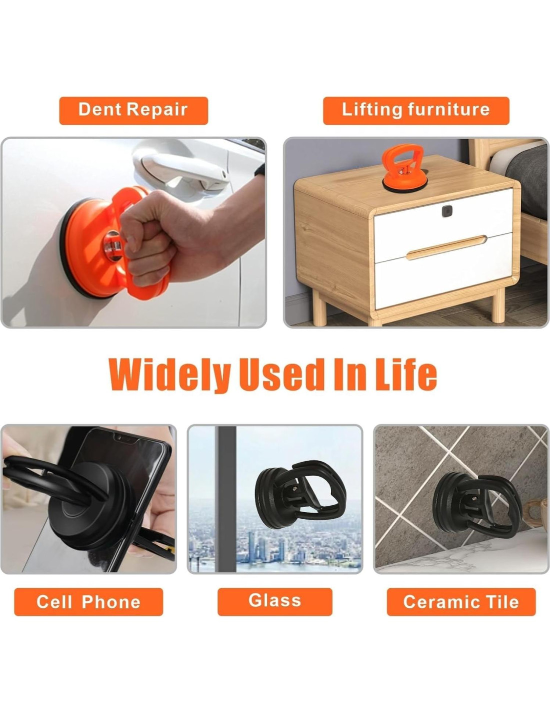- [Extractor de abolladuras de múltiples usos] El extractor de abolladuras con ventosa es útil para quitar abolladuras de coches. Además, se utiliza ampliamente para levantar vidrio, acero, muebles, puertas y otros objetos lisos. Este versátil extractor de abolladuras es imprescindible para diversas aplicaciones, la herramienta para quitar abolladuras de coche es útil. También se puede usar para desensamblar pantallas o como soporte para teléfono para ver videos.